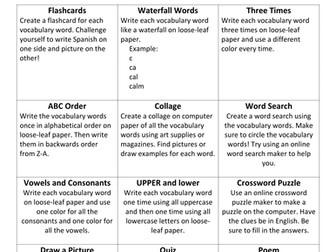 Spanish Vocabulary Homework Choice Board Teaching Resources